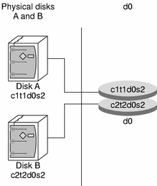 Figure 3-2 shows a volume "containing" two slices, one each from Disk A and Disk B. An application or UFS will treat the volume as if it were one physical disk. Adding more slices to the volume will increase its capacity.