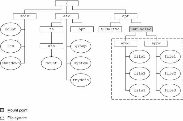 For example, the following figure shows a local file system, starting with a root (/) file system and the sbin, etc, and opt subdirectories.