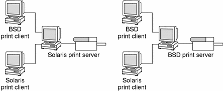 Print servers and print clients can run different versions of the Solaris release and different version of the UNIX operating system. Print clients running the Solaris 9 release and compatible versions can print to print servers running an lpd-based print service, such as the SunOS 4.1, BSD UNIX, and Linux releases. In addition, print clients running an lpd-based print service can print to print servers running the Solaris 9 release and compatible versions.