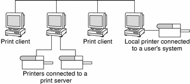 You must decide which systems will have local printers physically attached to them, and which will systems use printers on other systems. A system that has a local printer attached to it and makes the printer available to other systems on the network is called a print server. A system that sends its print requests to a print server is called a print client.