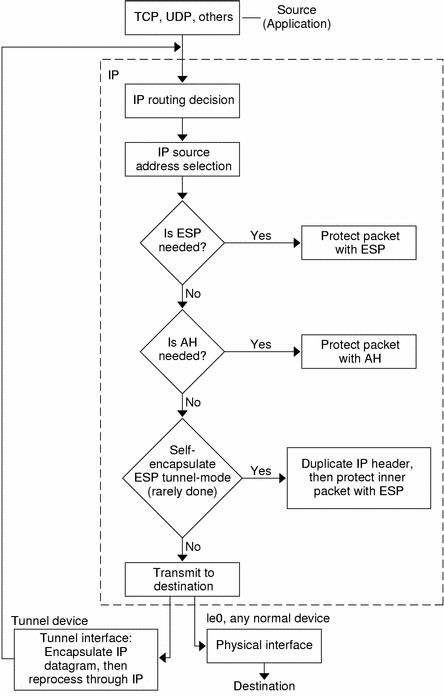Figure 19-1 shows how an IP addressed packet, as part of an IP datagram, proceeds when IPsec has been invoked on an outbound packet. As you can see from the flow diagram, authentication header (AH) and encapsulating security payload (ESP) entities can be applied to the packet. Subsequent sections describe how you apply these entities, as well as authentication and encryption algorithms.