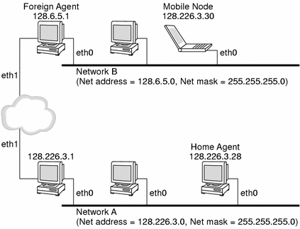 The following illustration shows a mobile node that resides on its home network, Network A, before the mobile node moves to a foreign network, Network B. Both networks support Mobile IP. The mobile node is always associated with the home address of the mobile node, 128.226.3.30.