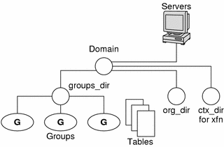 Remember that a domain is not an object, but a reference to a collection of objects. Therefore, a server that supports a domain is not actually associated with the domain but with the domain's directories. A domain consists of four directories: domain, ctx_dir.domain, org_dir.domain, and groups_dir.domain, as shown below.