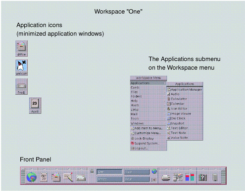 The CDE desktop comprises a Front Panel sitting over a selected workspace, or screen background. The Front Panel displays information about your workstation, and enables you to run applications, to log out, and to switch between workspaces. Applications that are running are represented by windows and icons on the workspace. As in OpenWindows, a Workspace menu is also available.