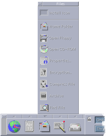 Like OpenWindows, CDE provides full-functioned File Manager and File Finder applications. The Files subpanel gives you access to these applications and to other file-related devices and applications.