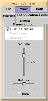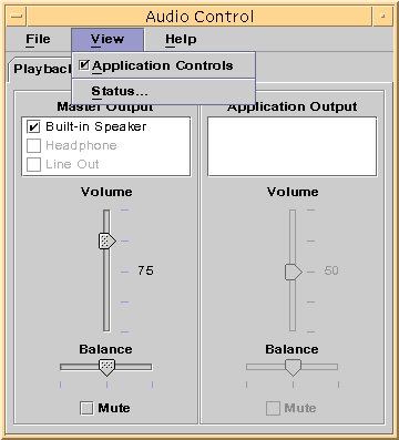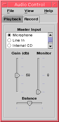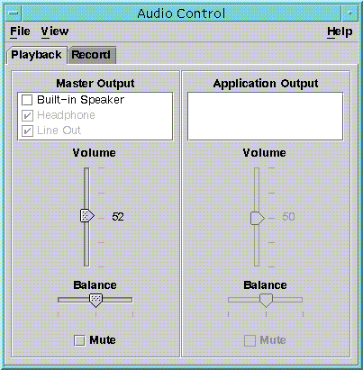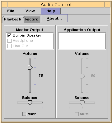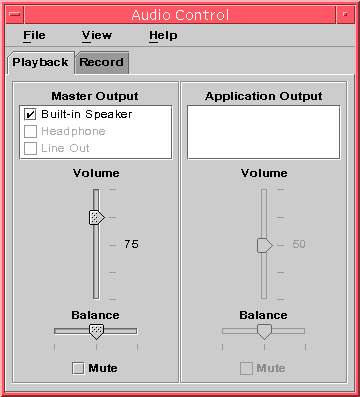 There are two tabs, Playback and Record. Audio Control detects the type of device being used and displays the appropriate tab. The Playback window appears if used with a play-only device, such as speakers. The Record tab appears when used with a record-only device, such as a microphone.
