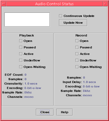 Process List Box -- this is a list of the items available for status monitoring. You can choose to view Master status or to see status for each of the running processes that are using dev/audio. You can choose only one process (or Master) to monitor at a time. As you select items in the list, the Playback and Record panes in the lower portion of the dialog update to reflect the status for the selected item being monitored.