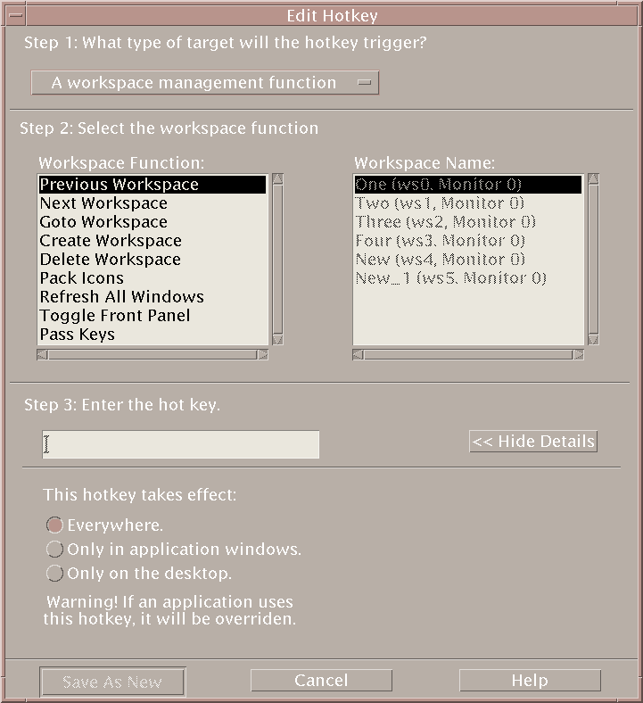 Use the Hotkey Editor to create, modify, or delete CDE hotkeys. Hotkey is a general term used to show the association between a specific key and a specified event (target event). For example, choosing Alt+Left will move the workspace to the left. The target event could be a CDE action, an application, a document, a workspace management function, or a multiple monitor management function.
