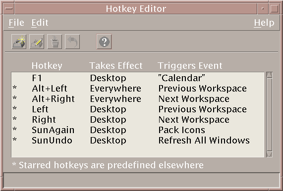You can only bring up one instance of the Hotkey Editor. The buttons on the toolbar can be used for creating, editing, and deleting hotkeys. Alternatively, right-click the mouse button over the display area for a drop-down list of the same menu options. At the bottom of the window is an explanation of what the starred items mean, as well as an update of the most recently executed action on a hotkey.
