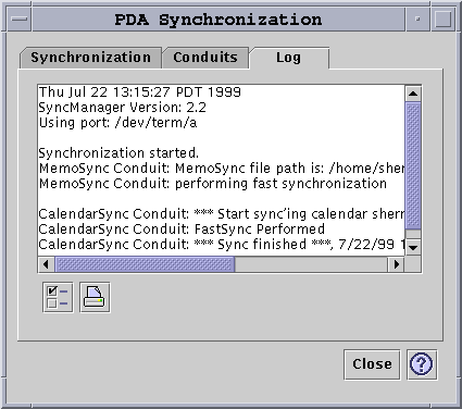 The third tab in the PDA Sync application lets you view the activity log for each synchronization. This area consists of a vertical and horizontal scrolling read-only text field, which displays a real-time log of a sync or install operation. Refer to the following figure.