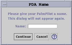 If you are synchronizing for the first time after installing PDA Sync, a dialog box appears asking you to name your organizer. If your organizer already has a name, this dialog box does not appear. Refer to the following figure.