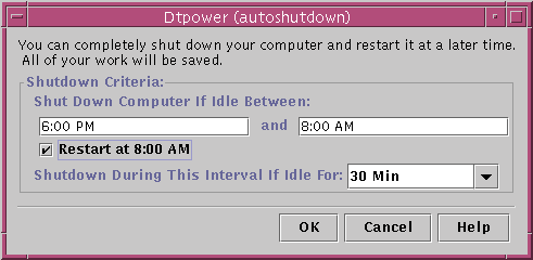 You can use the Dtpower program to specify times for your system to shut down automatically. This feature is called AutoShutdown. If you have a sun4u desktop machine, you can also set your system to power on automatically at a specified time. This feature is called AutoWakeup.