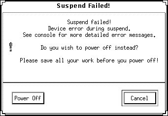 When the system fails to suspend, an alert appears. The exact message within the pop-up window may vary, depending on the cause of the problem, but the Suspend Failed window appears similar to the following figure.