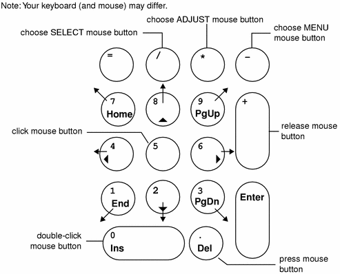 The 5, + (plus), 0 (zero) and . (decimal point) keys simulate mouse button clicks and presses.