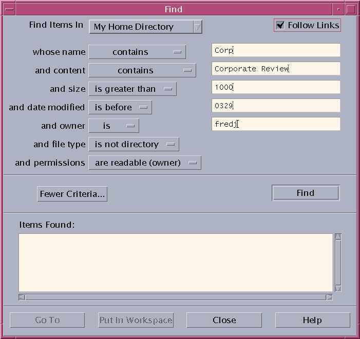 File Finder updates the Find dialog box to contain a line for specifying each of the selected criteria.