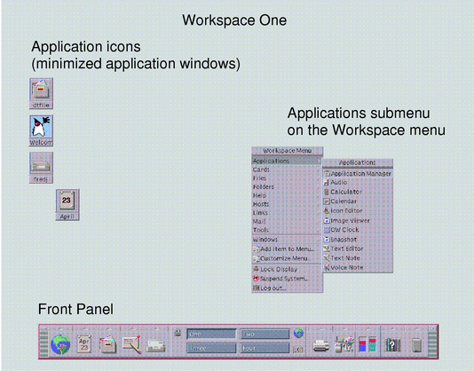 The CDE desktop comprises a Front Panel sitting over a selected workspace, or screen background. The Front Panel displays information about your workstation, and enables you to run applications, to log out, and to switch between workspaces. Applications that are running are represented by windows and icons on the workspace. You can also run commands from a Workspace menu, which is displayed when you click mouse button 3 on an unused part of the workspace backdrop.