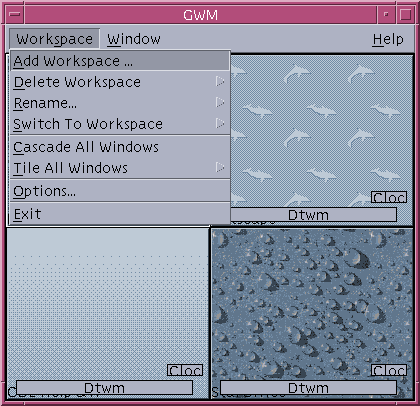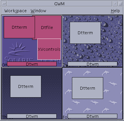 Graphical Workspace Manager enables you to operate a workspace "control panel". This panel displays a window containing a miniaturized picture of each workspace on the desktop. Workspaces may be created, deleted, renamed, tiled, or cascaded. Application windows may be moved (within or between workspaces), terminated, minimized, or maximized.
