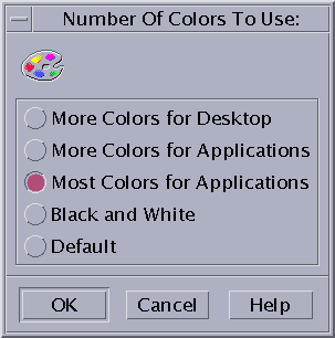 For example, if you have a high-color display and have selected More Colors for Desktop but you want to run a color-rich application such as a computer-aided design (CAD) program, you should choose More Colors for Applications or Most Colors for Applications to decrease the number of colors that the desktop uses. The remaining colors are available for the CAD program.