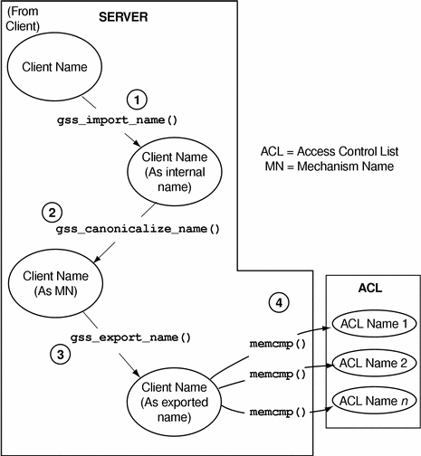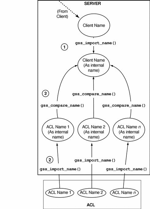 That procedure is fine if you only need to compare the client's name with a few names. However, it is a very slow way to check a large list! Running gss_import_name() and gss_compare_name() for every name in the ACL might require a lot of CPU cycles. This is a better way: