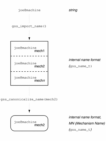 A gss_name_t structure can contain several versions of a single name -- one version produced for each mechanism supported by the GSS-API. That is, a gss_name_t structure for "joe@company" might contain one version of that name as rendered by Kerberos v5, another version as given by a different mechanism, and so on. The GSS-API provides a function, gss_canonicalize_name(), that takes as its input an internal name (that is, a gss_name_t structure) and a mechanism and yields a second internal name (also a gss_name_t) that contains only a single version of the name, specific to that mechanism.