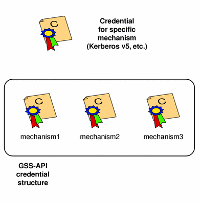 A given GSS-API credential is valid for a single principal. A single credential can contain several elements for that principal, each created by a different mechanism, as shown in Figure 1-7. This means that a credential acquired on a machine with several security mechanisms will be valid if transferred to a machine that has only a subset of those mechanisms. The GSS-API accesses credentials through the gss_cred_id_t structure; this structure is called a credential handle. Credentials are opaque to applications; you don't need to know the specifics of a given credential.