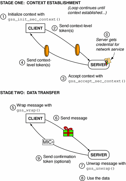 As stated earlier, the two most significant things that the GSS-API does in providing security are to create security contexts and to protect data. After an application has the credential(s) it needs, it's time to establish a security context. To do this, one application (typically a client) initiates the context, and another (usually a server) accepts it. Multiple contexts between peers are allowed.