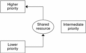Consider the case depicted in the following figure, where a high-priority process requires a shared resource. A lower priority process holds the resource and is pre-empted by an intermediate priority process, blocking the high-priority process. This condition can persist for an arbitrarily long time, because the amount of time that the high-priority process must wait for the resource depends not only on the duration of the critical section being executed by the lower-priority process, but on the duration of the intermediate process blocks. Any number of intermediate processes can be involved.