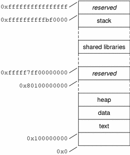 The diagram below shows the default address space provided to a 64-bit application. The regions of the address space marked as reserved might not be mapped by applications. These restrictions might be relaxed on future systems.