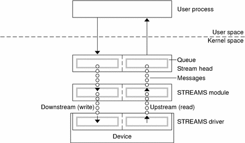 An application opens a STREAMS device, which creates the stream head to access the device driver. The stream head packages the data from the user process into STREAMS messages, and passes it downstream into kernel space. One or more cooperating modules can be pushed on a stream between the stream head and driver to customize the stream and perform any of a range of tasks on the data before passing it on. On the other hand, a stream might consist solely of the stream head and driver, with no module at all.