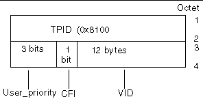 Tagging an Ethernet frame requires the addition of a tag header to the frame. The header is inserted immediately following the Destination MAC address and the Source MAC address. The tag header consists of two bytes of Ethernet Tag Protocol Identifier (TPID, 0x8100) and two bytes of Tag Control Information (TCI). FIGURE 3-1 shows the Ethernet Tag Header format.