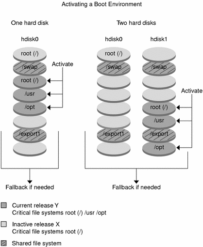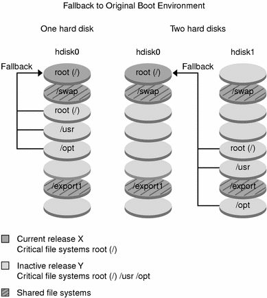 If a failure occurs, you can quickly fall back to the original boot environment with an activation and reboot. You need to fall back if the new boot environment cannot be booted, or if the new environment boots but does not work completely, or you are not satisfied with the results.