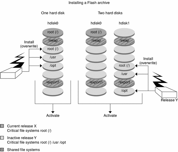 When you install the Web Start Flash archive on a system, the archive replaces all the files on the existing boot environment as an initial installation would. Figure 30-5 shows an installation of a Web Start Flash archive on an inactive boot environment. For procedures on installing a Web Start Flash archive, see "Installing Web Start Flash Archives on a Boot Environment".
