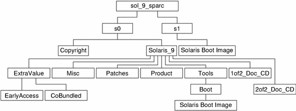 The following figure shows the directory structure on the Solaris 9 Multilingual Installation CD or Solaris 9 Installation CD.