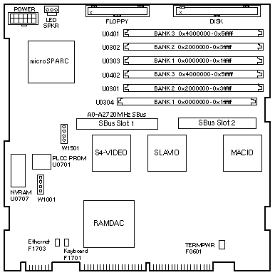 - The 501-2960 CPU has no VRAM at U1001 to U1008 and no Video Clock Generator