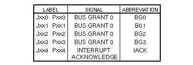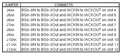 Volume I: BackplaneBackplane InformationThis section contains bus signal charts and backplane layout illustrations. VMEbus BackplaneCardcage slot numbers are stamped, printed, or labeled on the sheet metal near the card ejectors. VMEbus backplane jumpers are silk-screened on the cardcage as Px00, Px01, Px02, Px03, and Px04 or Jx00, Jx01, Jx02, Jx03, and Jx04; where x represents the card slot number. These jumpers control VMEbus signals BUS GRANT 0-3 IN (BG0-3IN) to BUS GRANT 0-3 OUT (BG0-3 OUT), and INTERRUPT ACKNOWLEDGE IN (IACKIN) to INTERRUPT ACKNOWLEDGE OUT (IACKOUT). The VMEbus signals are referred to as BG0, BG1, BG2, BG3, and IACK in this section.