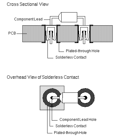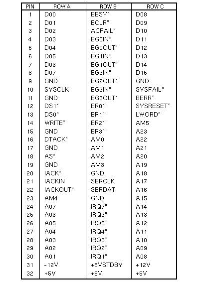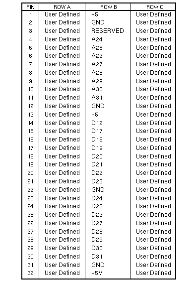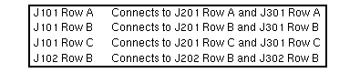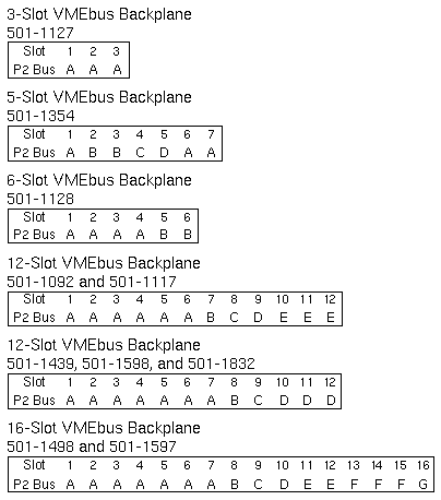 VMEbus SignalsThe VMEbus consists of signals on J1/P1 Row A, J1/P1 Row B, J1/P1 Row C, and J2/P2 Row B. P2 Bus SignalsThe Sun P2 Bus consists of signals on J2/P2 Row A, J2/P2 Row C, and J3/P3 Row B. VMEbus J1/P1 Pinouts VMEbus J2/P2 Pinouts VMEbus J3/P3 Pinouts Pressfit BackplanesPressfit Backplane production began in June 1987. Solderless contacts are machine pressed into plated-through holes on printed circuit boards. Component leads installed into the solderless contacts are held in place by a tapered entry, multi-finger contact design. 501-1439, 501-1598, and 501-1832 12-Slot BackplanesThe Sun P2 bus connects cardcage Slots 1 through 7 to each other, and cardcage Slots 10, 11, and 12 to each other. In addition to the Sun P2 bus and the VMEbus, the 12-slot backplane has a private Internal bus that connects Slots 1, 2, and 3 as shown below. J1/P1, Rows A, B, and C, on Slots 1, 2, and 3 are not connected to the VMEbus. Boards that use the VMEbus cannot be used in Slots 1, 2, or 3. J2/P2, Row B, is connected between Slots 1 through 7. The 501-1439 Backplane terminates J2/P2, Row C, Pins 75 and 96 with a 40.2W resistor and a 47pf capacitor. The 501-1598 and 501-1832 Backplanes terminate J2/P2, Row C, Pins 75 and 96 with a 200W resistor. Termination is jumper selectable. The Sun 4400 CPU is not supported in the 501-1439 Backplane. The function of the backplane jumpers is shown below. Backplane Sun P2 or Private Bus ConnectionBackplane slots that share an adjacent P2 bus are marked with the same letter in the charts below. | ||||||||||||
