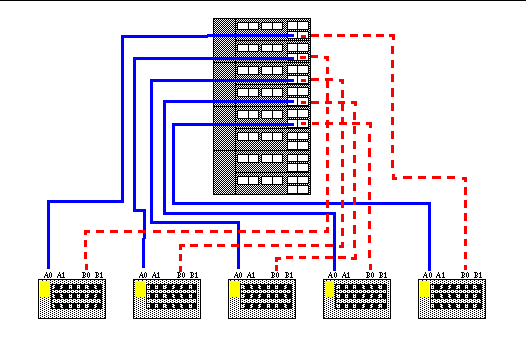 This is the optimal single host split loop config because it delivers both the highest fault tolerance and performance by utilizing all 4 loops on 4 separate HBAs and sbuses. 7). Dual Host, single loop