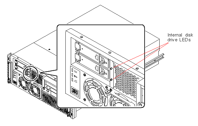 The disk LEDs are visible from the front of the system when the left door is open, as shown in the following figure.