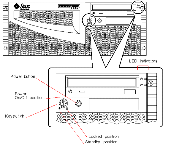 The two system LEDs consist of a system health indicator and a fault indicator. The system health indicator lights continuously green to show that the system is functioning normally. The fault indicator lights when a problem is detected in the system. Because it is important to know that a fault exists in the system, the fault indicator remains lit whether the system is in normal operating mode, or is switched to Standby mode using the keyswitch.