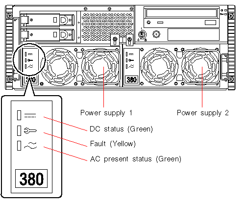 This green LED is lit to indicate that the primary circuit has power. When this LED is lit, the power supply is providing Standby power to the system.