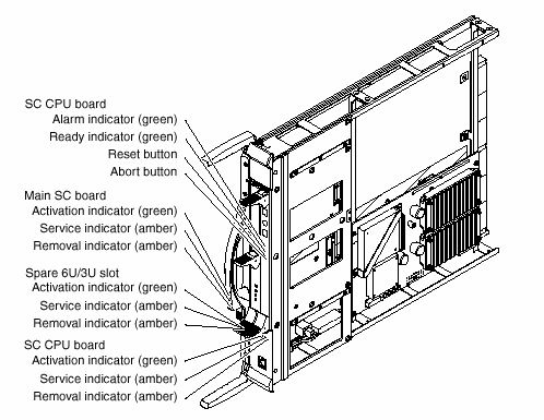 Global reset to the SC CPU and PCI reset to the SC. Using the RESET button will reboot the operating system on the SC if the appropriate open boot PROM environment variables have been set. |