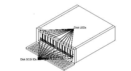 On the disk labels, split rectangles in front of each disk slot are color-coded to show the SCSI IDs for the disk.