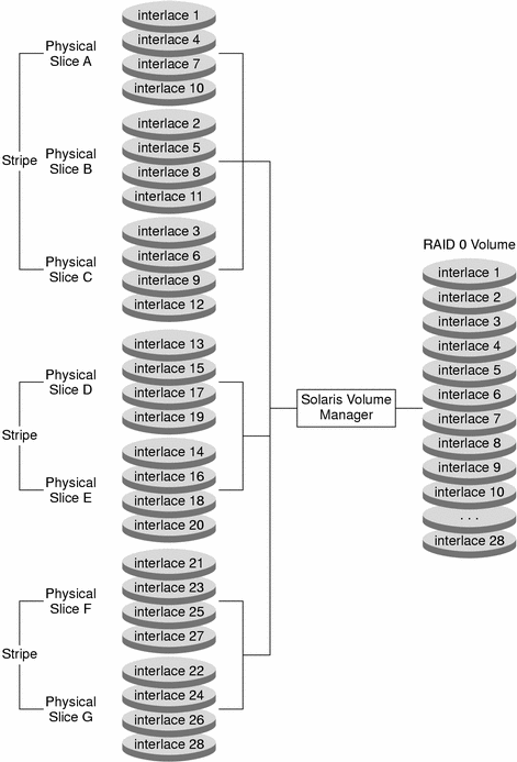 RAID 0 volumes provide the fundamental building blocks for aggregating storage or building mirrors. The following example, drawing on the sample system explained in Chapter 4, Configuring and Using Solaris Volume Manager (Scenario), describes how RAID 0 volumes can provide larger storage spaces and allow you to construct a mirror of existing file systems, including root (/).