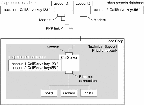 The only link from the Technical Support department network to the outside world is the serial line to the dial-in server's end of the PPP link. The system administrators configure the laptop computer of each field service representative for PPP with CHAP security, including a CHAP secret. The chap-secrets database on the dial-in server contains the CHAP credentials for all machines that are allowed to call in to the Technical Support network.