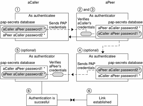 (Optional) If the caller authenticates responses from remote peers, the remote peer must send its own PAP credentials to the caller. Thus, the remote peer becomes the authenticatee and the caller the authenticator.