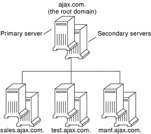 If your company is large enough, it might support a number of domains, organized into a local namespace. The following figure shows a domain hierarchy that might be in place in a single company. The top-level, or "root" domain for the organization is ajax.com, which has three subdomains, sales.ajax.com, test.ajax.com, and manf.ajax.com.