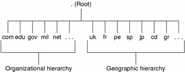 It consists of the root directory, represented as a dot (.), and two top level domain hierarchies, one organizational and one geographical. Note that the com domain introduced in this figure is one of a number of top-level organizational domains in existence on the Internet.