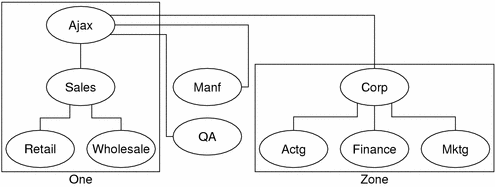 For example, the Ajax domain shown in the above contains a top domain (Ajax), four subdomains, and five sub-subdomains. It is divided into four zones.. Thus, the Ajax name server administers a zone composed of the Ajax, Sales, Retail, and Wholesale domains. The Manf and QA domains are zones unto themselves served by their own name servers, and the Corp name server manages a zone composed of the Corp, Actg, Finance, and Mktg domains.