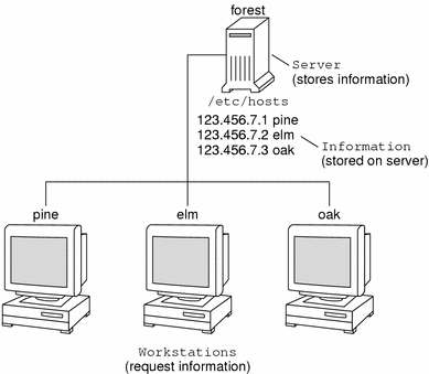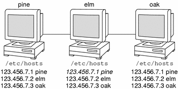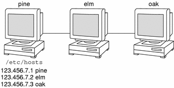 For example, take a network of three machines named, pine, elm, and oak. Before pine can send a message to either elm or oak, it must know their numerical network addresses. For this reason, it keeps a file, /etc/hosts or /etc/inet/ipnodes, that stores the network address of every machine in the network, including itself.