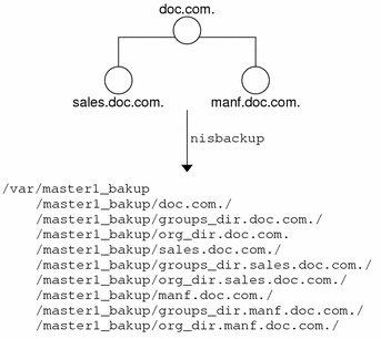 For example, to backup the doc.com. namespace to a /master1_bakup directory, you would run nisbackup on the root master as follows: